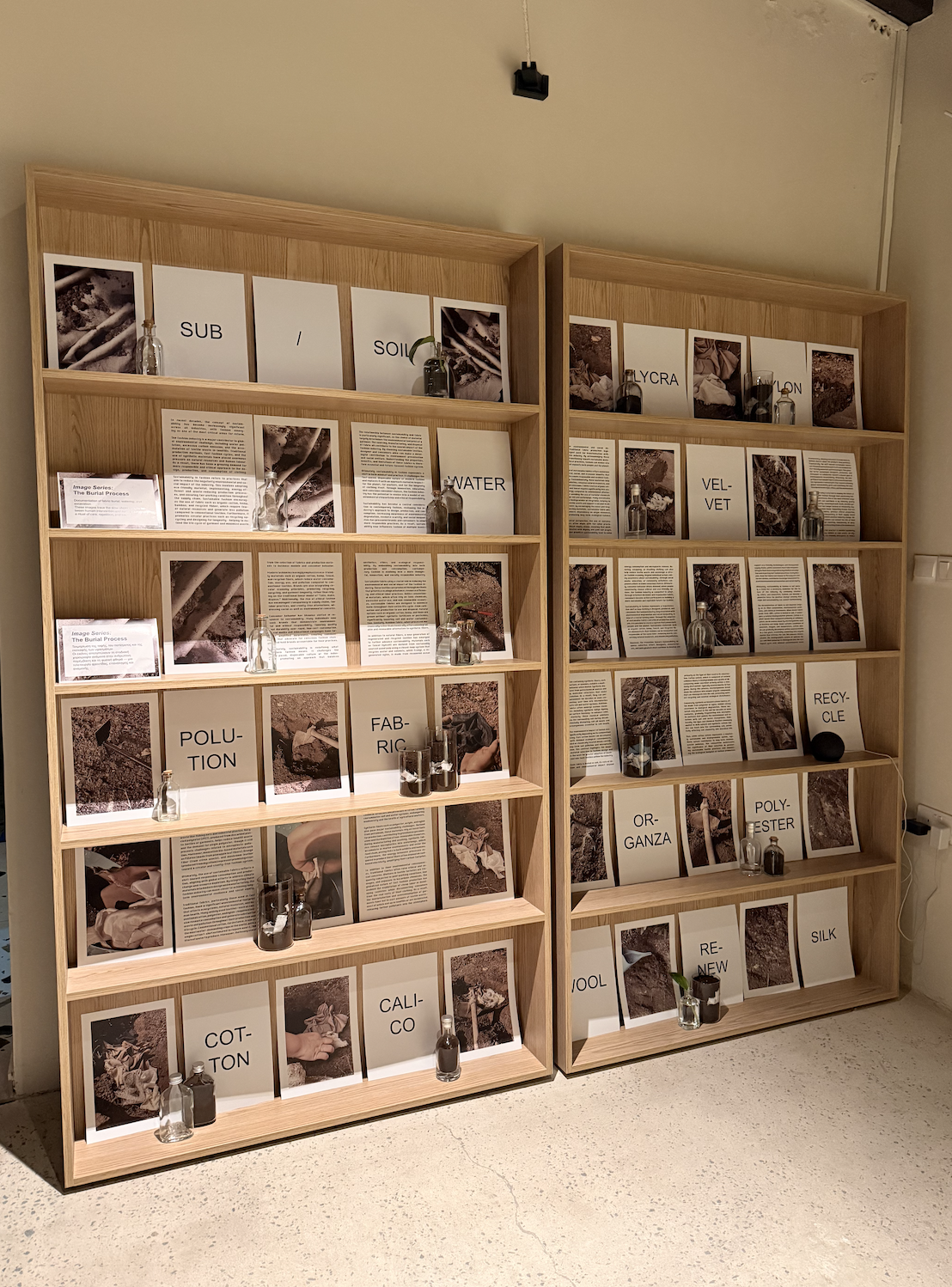 The concept for this room draws directly from the designer Eva’s undergraduate research project, which explored the burial of textiles as both a material and conceptual process. This research is translated into a spatial installation, where a photographic series documents the act of burying fabric, repositioning textile production within a cyclical and ecological framework.