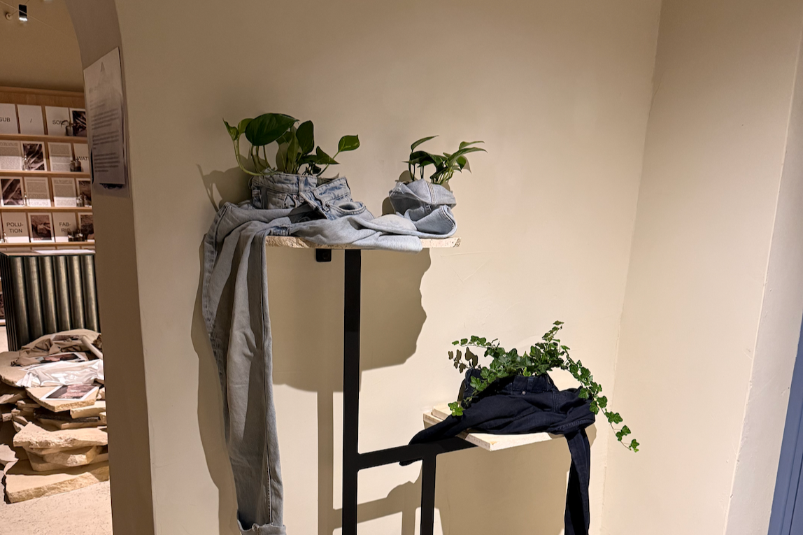 This space presents The Denim Project, a collaboration between Eva and her sister that focuses on denim as both material and process. The installations bring together the “planted denim”, where denim is reimagined as soil, a medium for transformation and growth, the final garments available within the space, and a projection documenting the making process.